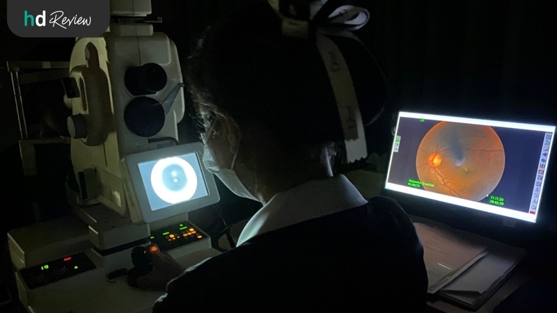 Selama pemeriksaan retina, perawat mematikan semua lampu di ruangan. Hanya tersisa cahaya-cahaya redup sebagai sumber penerangan.